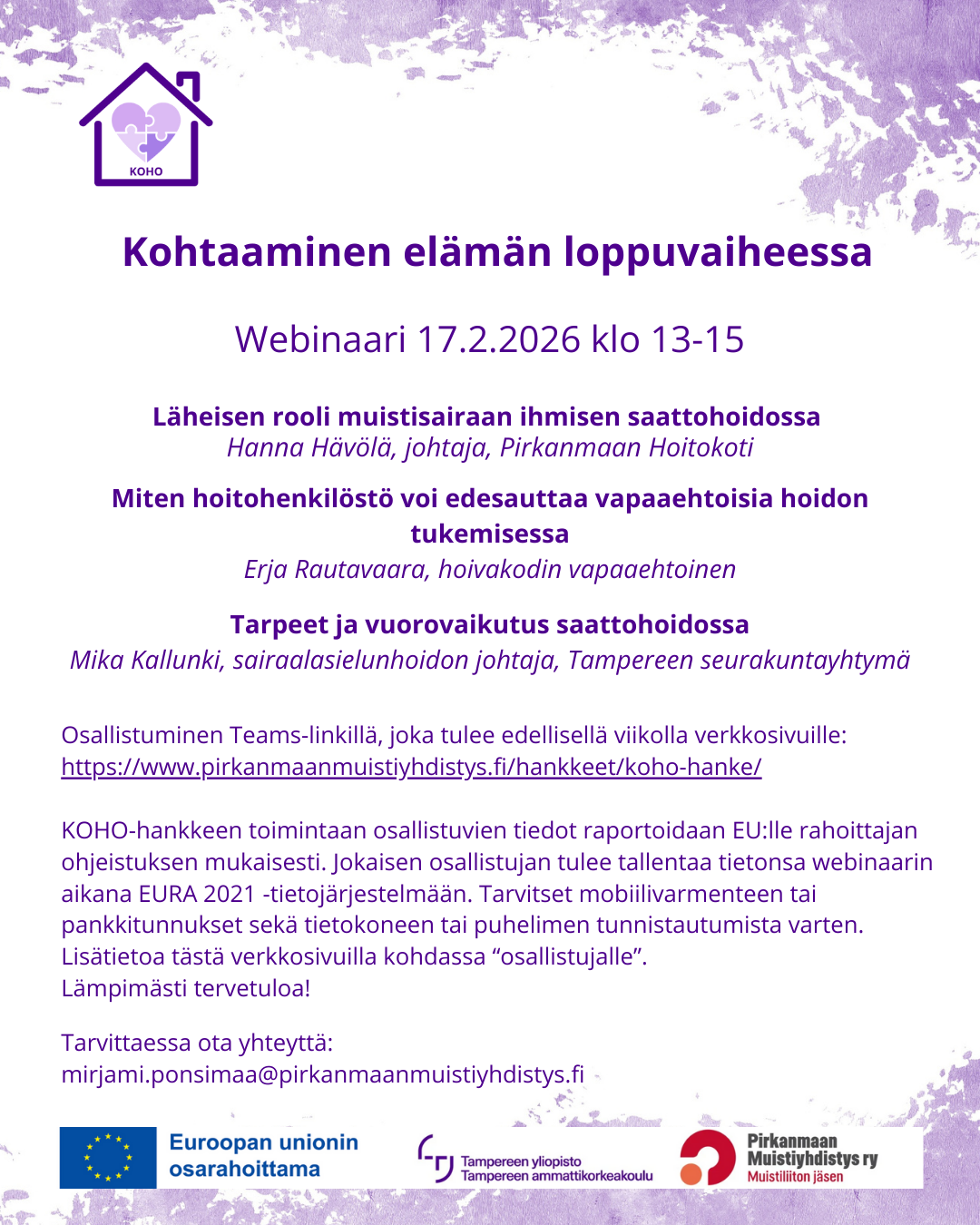 Lämpimästi tervetuloa KOHO-hankkeen webinaariin Kohtaaminen elämän loppuvaiheessa 17.2.2026 klo 13–15. Tilaisuus on tarkoitettu prikanmaalaisten hoivakotien työntekijöille eikä siihen tarvitse…