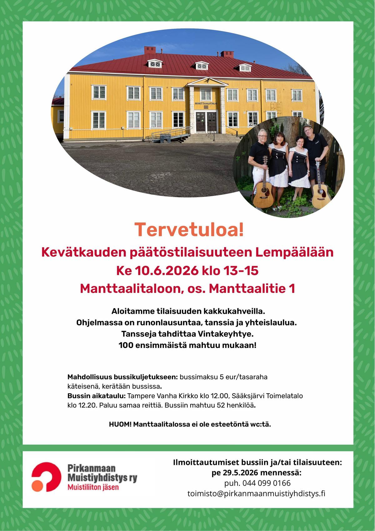 Perinteinen kevätkauden päätös. Tarjolla kakkukahvit, ohjelmaa ja lopuksi Vintake-yhtyeen tahdissa tanssit. Mukaan mahtuu 100 ensiksi ilmoittautunutta. Bussikyytiin mahtuu 52 ensimmäistä, bussimaksu 5 €, tasaraha mukaan bussiin. Lisätiedot ja ilmoittautuminen 29.5.2026 mennessä toimistoon.