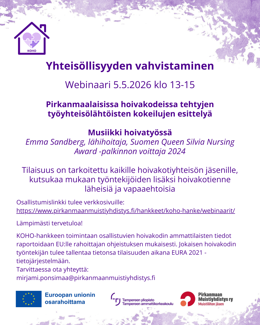 KOHO-hankkeen seuraava webinaari pirkanmaalaisten hoivakotien työntekijöille järjestetään 16.9.2025 klo 13-15. Oheisessa mainoksessa lisätietoja. Tilaisuuteen ei tarvitse ilmoittautua etukäteen.