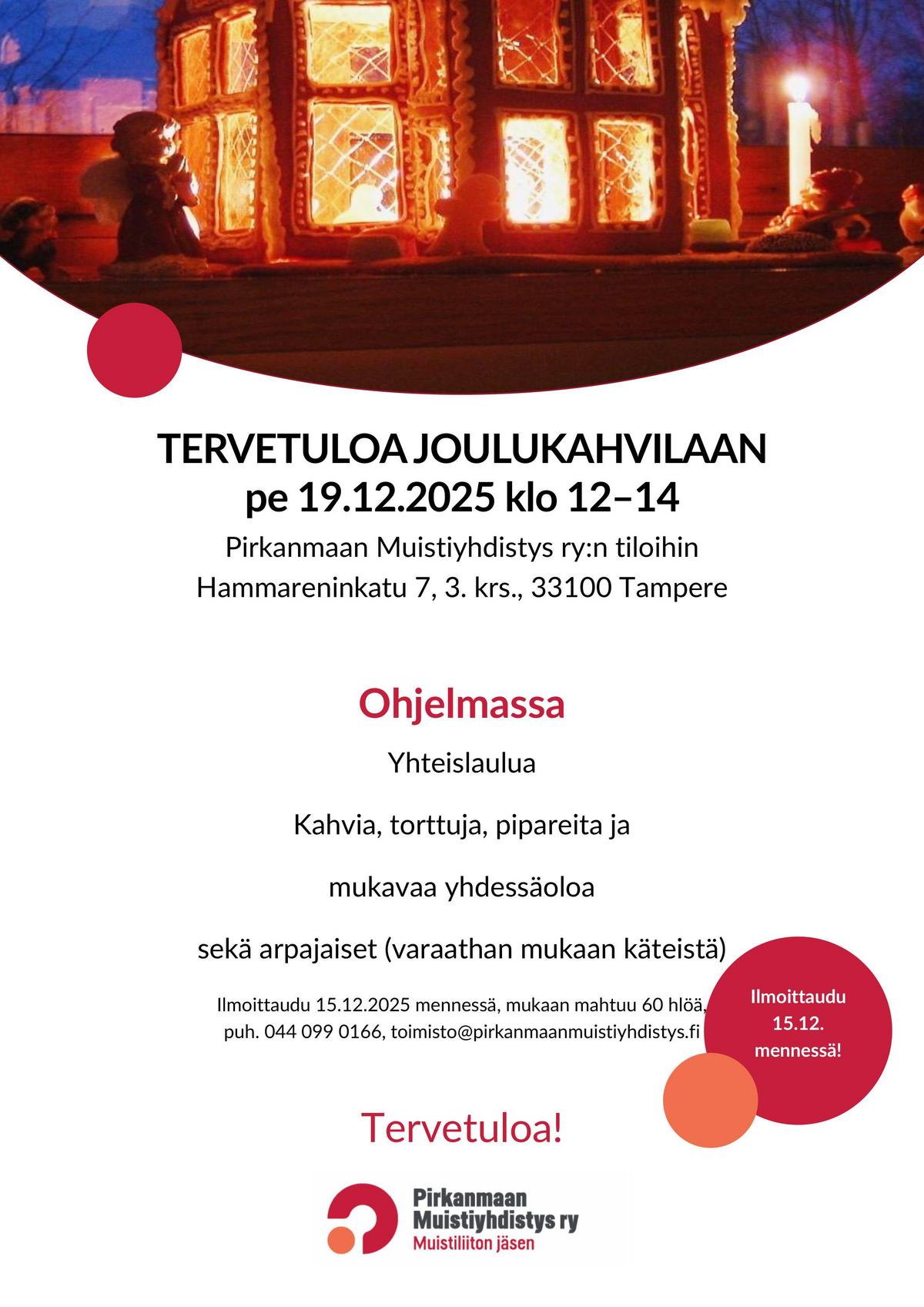 Perinteisen puurojuhlan sijaan tänä vuonna järjestämme Joulukahvilan pe 19.12.2025 klo 12-14 yhdistyksen toimitiloissa. Luvassa on mm. yhteislaulua, arpajaiset ja mukavaa yhdessäoloa. Tarjolla kahvia, torttuja ja pipareita. Ilmoittaudu toimistoon 15.12.2025 mennessä, mukaan mahtuu 60 hlöä.